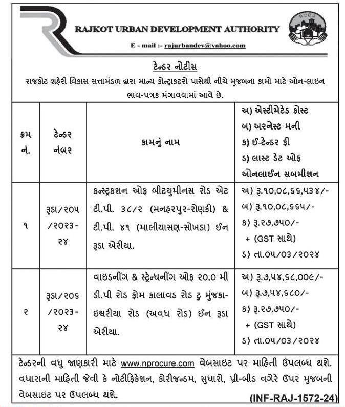 RAJKOT URBAN DEVELOPMENT AUTHORITY has floated a e tender for Construction Of Bituminous Road At Tp 38/2 And Tp 41 at Rajkot&#rl&#nl&#rl&#nl. The project location is Rajkot, Gujarat, India. The reference number is 205/2023-24 and it is closing on 29-Feb-2024. Find more about this online tender from below to Submit your bid.