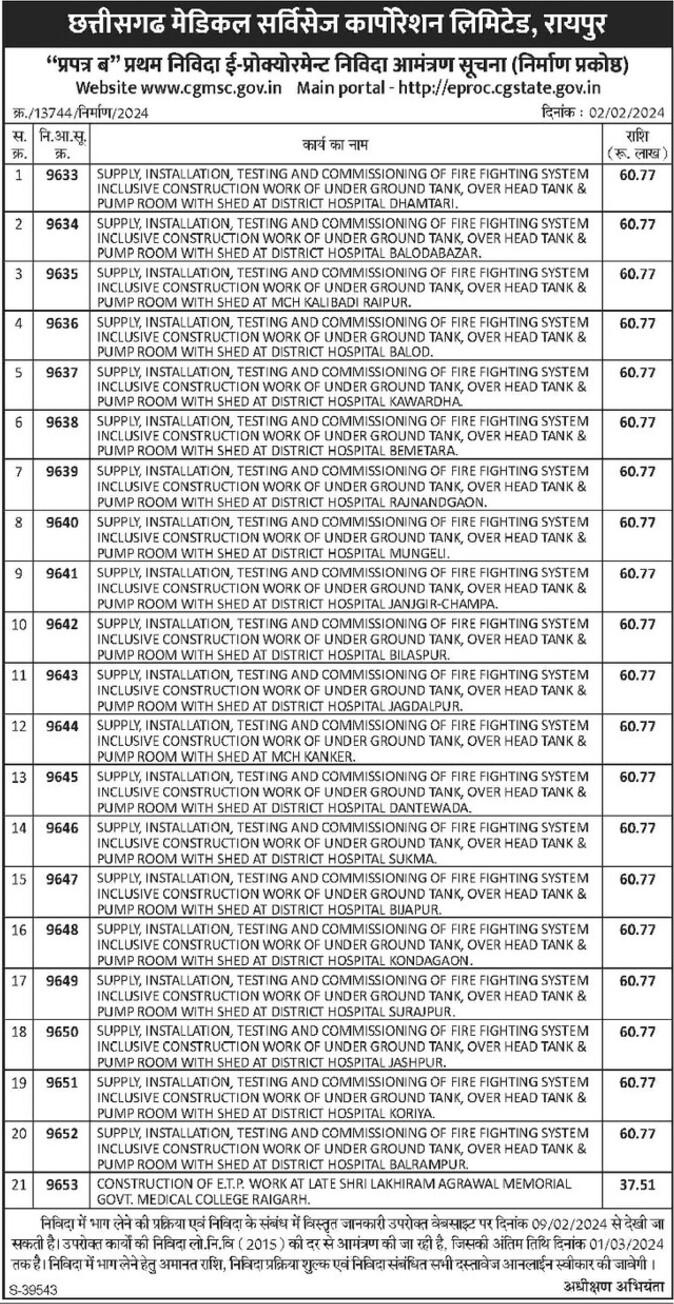 District Hospital Raipur has floated a e tender for Tender For Supply, Installation, Testing And Commissioning Of Fire Fighting System Inclusive Construction Work Of Under Tank, Over Head Tank And Pump Room With Shed.. The project location is Raipur, Chhattisgarh, India. The reference number is 13744/2024 and it is closing on 1-Mar-2024. Find more about this online tender from below to Submit your bid.