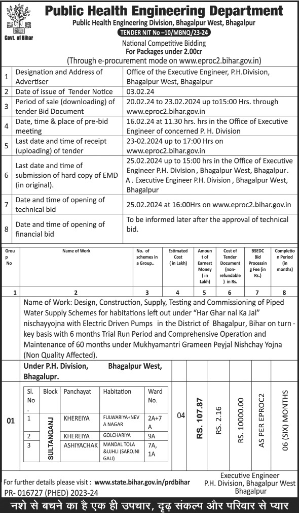PUBLIC HEALTH ENGINEERING DEPARTMENT, GOVT OF BIHAR has floated a e tender for Tender For Design, Construction, Supply, Testing And Commissioning Of Piped Water Supply Schemes For Habitations Left Out Under Har Ghar Nal Ka Jal Nischay Yojna With Electric Driven Pumps On Turn-Key Basis With 06 Months Trial Run Period And Compreh. The project location is Bhagalpur, Bihar, India. The reference number is 10/23-24 and it is closing on 23-Feb-2024. Find more about this online tender from below to Submit your bid.