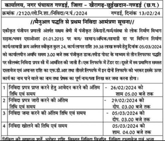 Nagar Panchayat Khairagarh has floated a e tender for Supply Of Construction Material.. The project location is Khairagarh, Chhattisgarh, India. The reference number is 2120/2024 and it is closing on 5-Mar-2024. Find more about this online tender from below to Submit your bid.