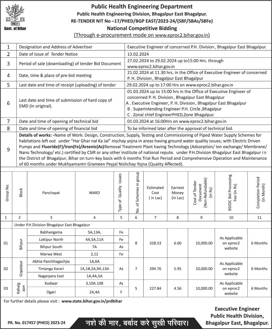 PUBLIC HEALTH ENGINEERING DEPARTMENT, GOVT OF BIHAR has floated a e tender for Tender For Design, Construction, Supply, Testing And Commissioning Of Piped Water Supply Schemes For Habitations Left Out Under Har Ghar Nal Ka Jal Nischay Yojna In Areas Having Ground Water Quality Issues; With Electric Driven Pumps And Fluoridef/Ir. The project location is Bhagalpur, Bihar, India. The reference number is 17/2023-24 and it is closing on 29-Feb-2024. Find more about this online tender from below to Submit your bid.