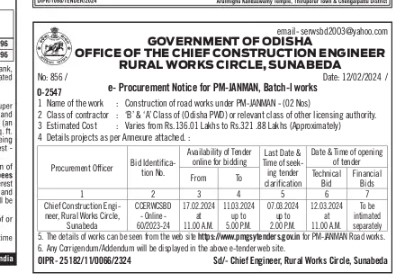 Rural Works Department, Sunabeda has floated a e tender for Tender For Construction Of Road Works Under Pm-Janman-02 Nos At Sunabeda.. The project location is Sunabeda, Odisha, India. The reference number is CCERWCSBO-Online-60/2023-24 and it is closing on 11-Mar-2024. Find more about this online tender from below to Submit your bid.