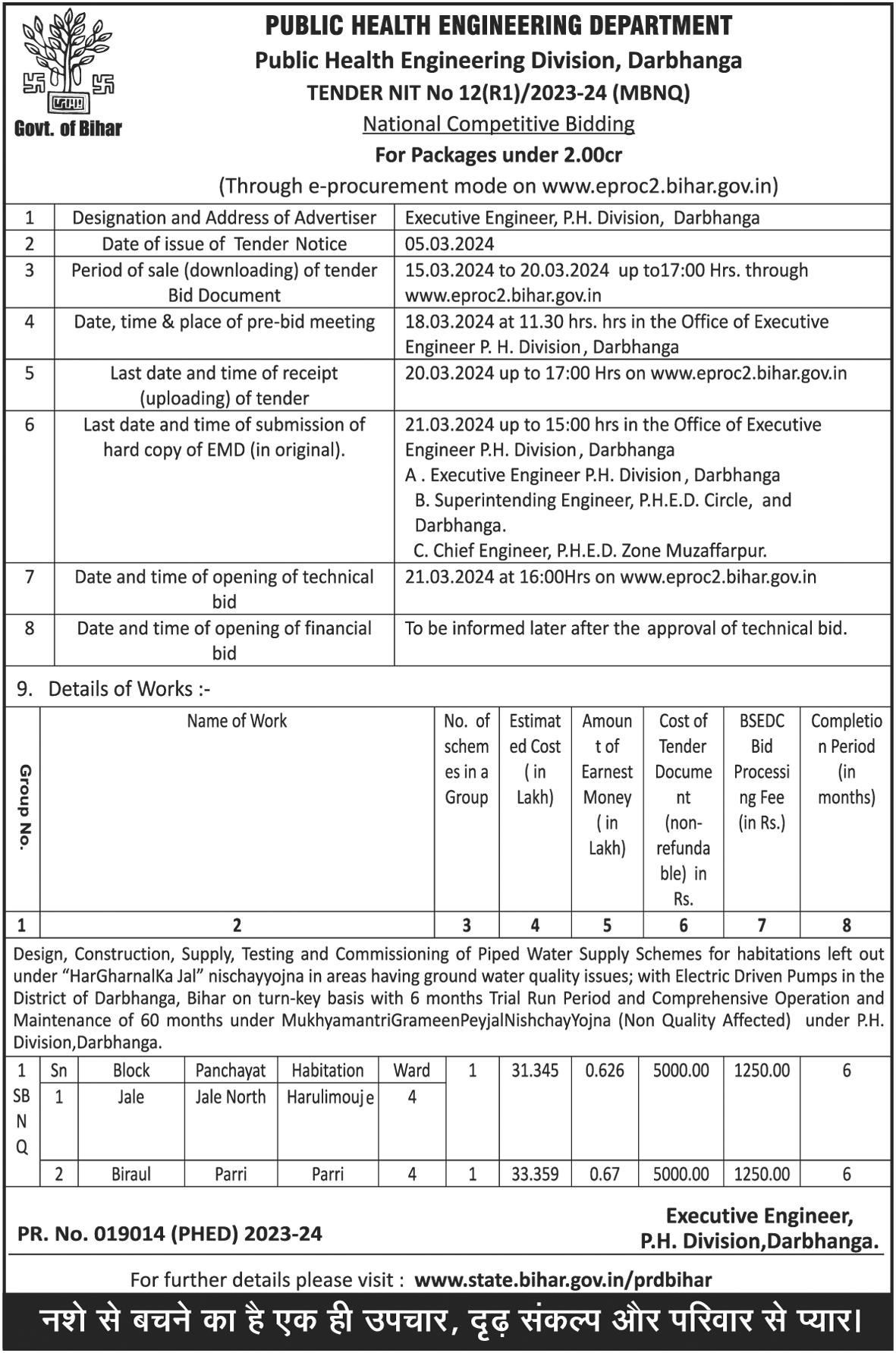 PUBLIC HEALTH ENGINEERING DEPARTMENT, GOVT OF BIHAR has floated a e tender for Tender For Design, Construction, Supply, Testing And Commissioning Of Piped Water Supply Schemes For Habitations Left Out Under Har Ghar Nal Ka Jal Nischay Yojna In Areas Having Ground Water Quality Issues ; With Electric Driven Pumps On Turn - Key B. The project location is Darbhanga, Bihar, India. The reference number is 12/2023-24 and it is closing on 20-Mar-2024. Find more about this online tender from below to Submit your bid.
