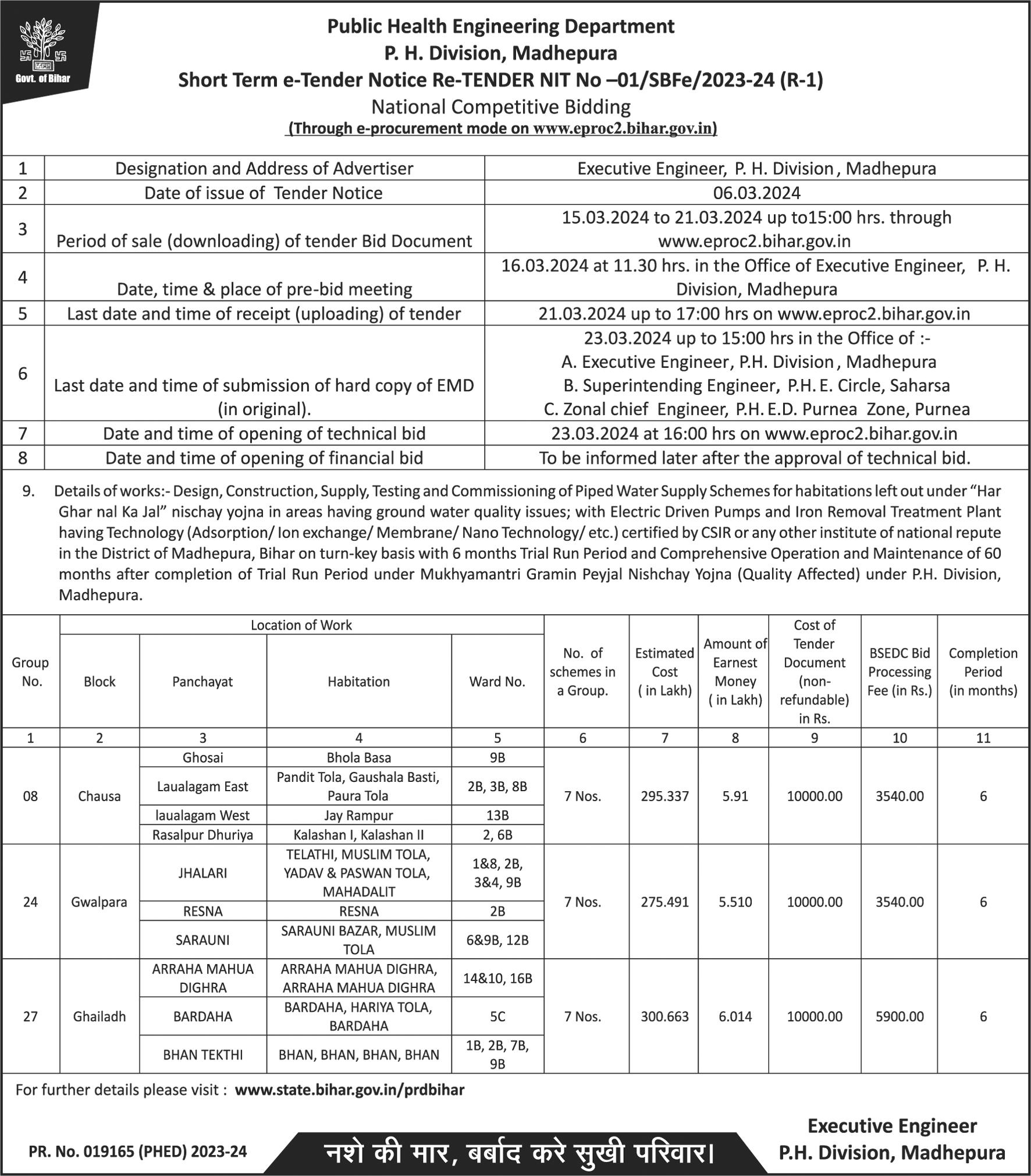 Design, Construction, Supply, Testing And Commissioning Of Piped Water Supply Schemes For Habitations Left Out Under Har Ghar Nal Ka Jal Nischay Yojna In Areas Having Ground Water Quality Issues ; With Electric Driven Pumps On Turn - Key Basis With 6 Months Trial Run Period And Comprehensive Operation And Maintenance Of 60 Months Under Mukhya Mantra Grameen Peyjal Nischay Yojna at Madhepura&#rl;&#nl;Tender Doc Cost- 10000&#rl;&#nl;Tender Fee- 3540