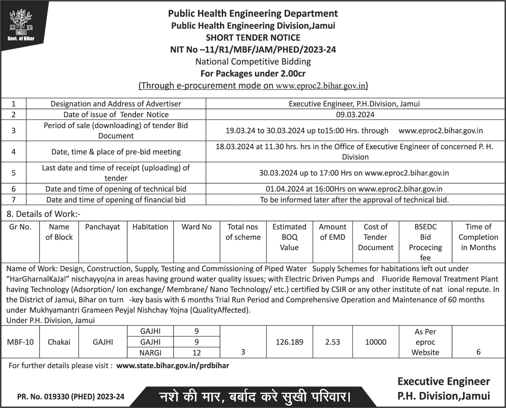 PUBLIC HEALTH ENGINEERING DEPARTMENT, GOVT OF BIHAR has floated a e tender for Tender For Design, Construction, Supply, Testing And Commissioning Of Piped Water Supply Schemes For Habitations Left Out Under Har Ghar Nal Ka Jal Nischay I Areas Having Ground Water Qulity Issues ; With Electric Driven Pumps And Iron Removal Treatm. The project location is Patna, Bihar, India. The reference number is 11/2023-24 and it is closing on 30-Mar-2024. Find more about this online tender from below to Submit your bid.