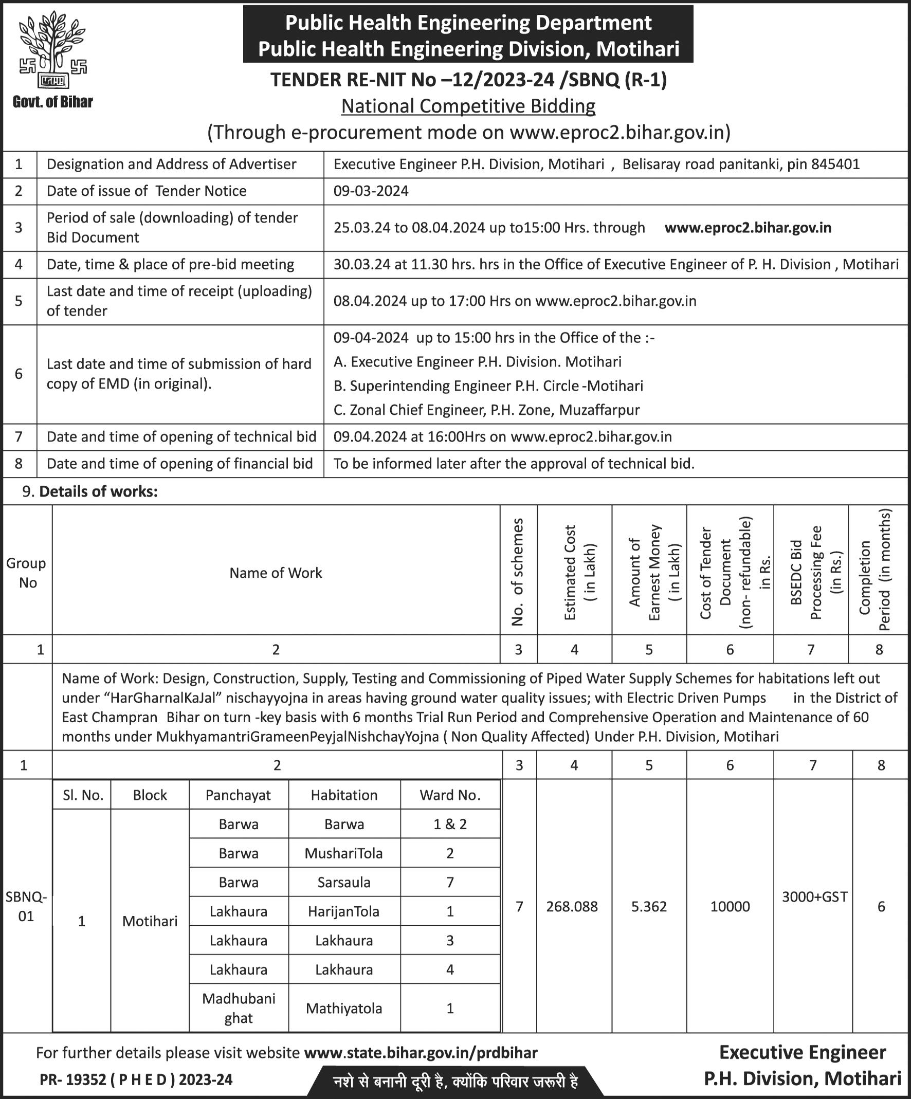 PUBLIC HEALTH ENGINEERING DEPARTMENT, GOVT OF BIHAR has floated a e tender for Tender For Design, Construction, Supply, Testing And Commissioning Of Piped Water Supply Schemes For Habitations Left Out Under Har Ghar Nal Ka Jal Nischay I Areas Having Ground Water Qulity Issues ; With Electric Driven Pumps And Iron Removal Treatm. The project location is Motihari , Bihar, India. The reference number is 12/2023-24 and it is closing on 8-Apr-2024. Find more about this online tender from below to Submit your bid.