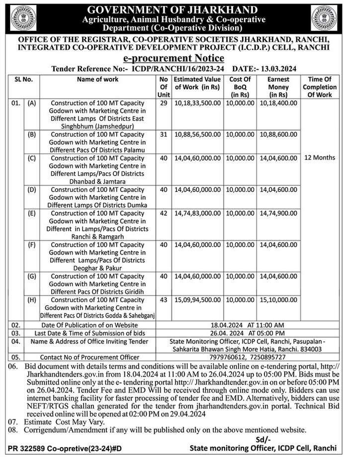 DEPARTMENT OF AGRICULTURE, GOVT OF JHARKHAND has floated a e tender for Tender For Construction Of 100 Mt Capacity Godown With Marketing Centre In Different Pacs At Dhanbad & Jamtara.&#rl;&#nl;. The project location is Ranchi, Jharkhand, India. The reference number is ICDP/RANCHI/16/2023-24 and it is closing on 26-Apr-2024. Find more about this online tender from below to Submit your bid.
