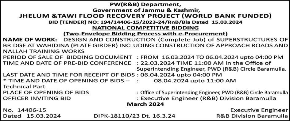 PUBLIC WORKS DEPARTMENT, GOVT OF JAMMU AND KASHMIR has floated a e tender for Tender For Design And Construction Complete Job Of Superstructures Of Bridge At Wahidina Plate Girder Including Construction Of Approach Roads And Nallah Training Works.. The project location is Jammu, Jammu and Kashmir, India. The reference number is 194/14406-15/2023-24/RnB/Bla and it is closing on 6-Apr-2024. Find more about this online tender from below to Submit your bid.