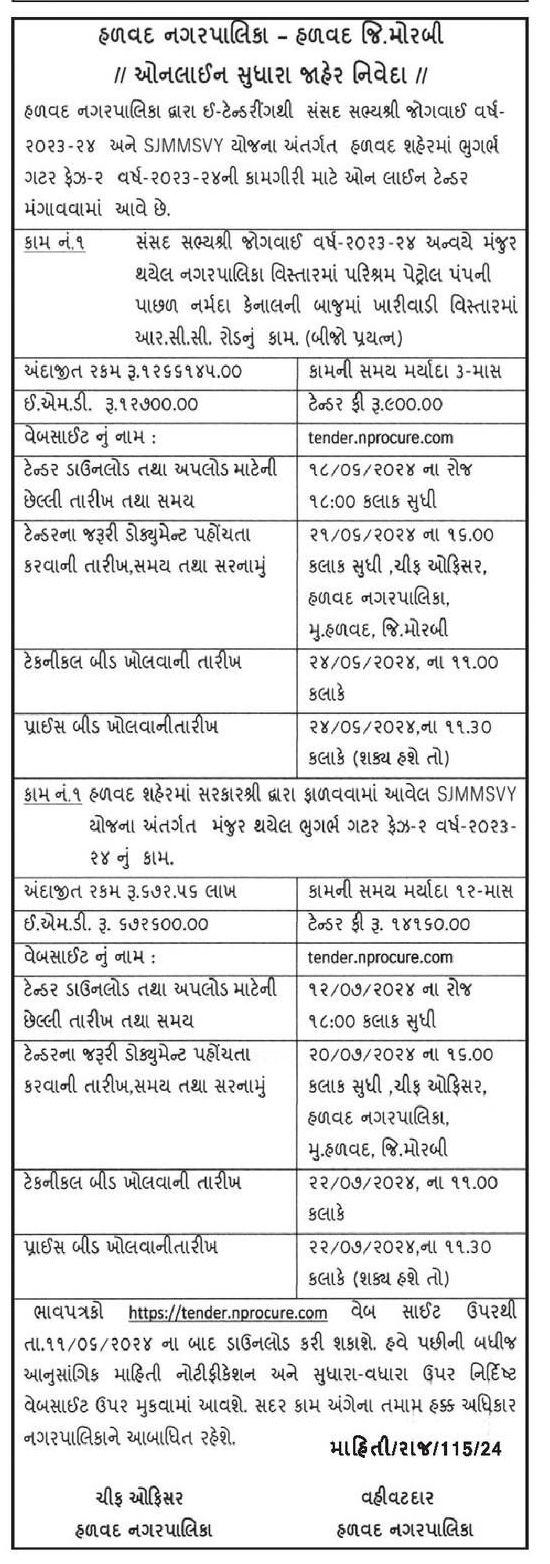 HALVAD NAGARPALIKA has floated a e tender for Tender For Construction Of Rcc Road In Kharivadi Area.. The project location is HALVAD, Gujarat, India. The reference number is and it is closing on 18-Jun-2024. Find more about this online tender from below to Submit your bid.