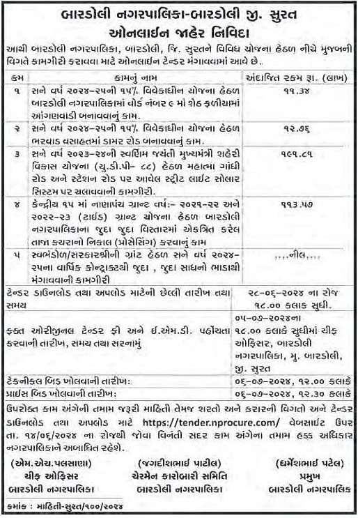 Bardoli Municipality has floated a e tender for Tender For Construction Of Anganwadi In Sheth Faliya.. The project location is Bardoli, Gujarat, India. The reference number is and it is closing on 28-Jun-2024. Find more about this online tender from below to Submit your bid.
